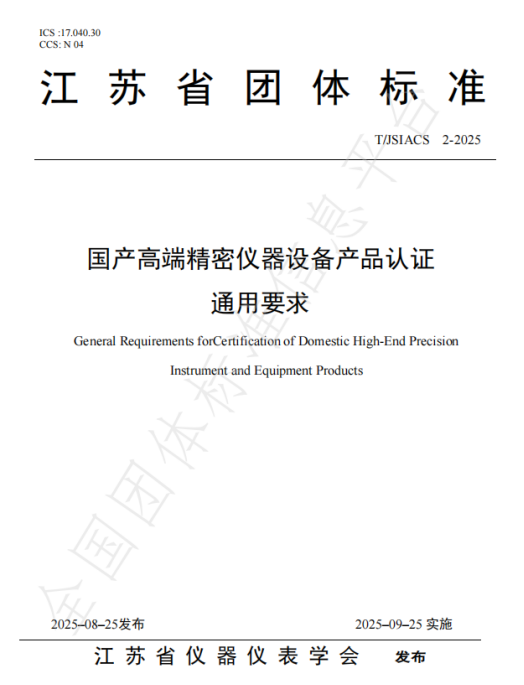 近日,江蘇省儀器儀表學(xué)會(huì)正式批準(zhǔn)發(fā)布團(tuán)體標(biāo)準(zhǔn)《國(guó)產(chǎn)高端精密儀器設(shè)備產(chǎn)品認(rèn)證通用要求》(標(biāo)準(zhǔn)編號(hào):T/JSIACS 2 - 2025)。該標(biāo)準(zhǔn)嚴(yán)格依據(jù)《江蘇省儀器儀表學(xué)會(huì)標(biāo)準(zhǔn)管理辦法(試行)》制定,圍繞國(guó)產(chǎn)高端精密儀器設(shè)備產(chǎn)品認(rèn)證,在基本要求、國(guó)產(chǎn)化要求、品質(zhì)屬性等關(guān)鍵維度作出明確規(guī)范,適用于國(guó)產(chǎn)高端精密儀器設(shè)備產(chǎn)品的通用認(rèn)證場(chǎng)景。